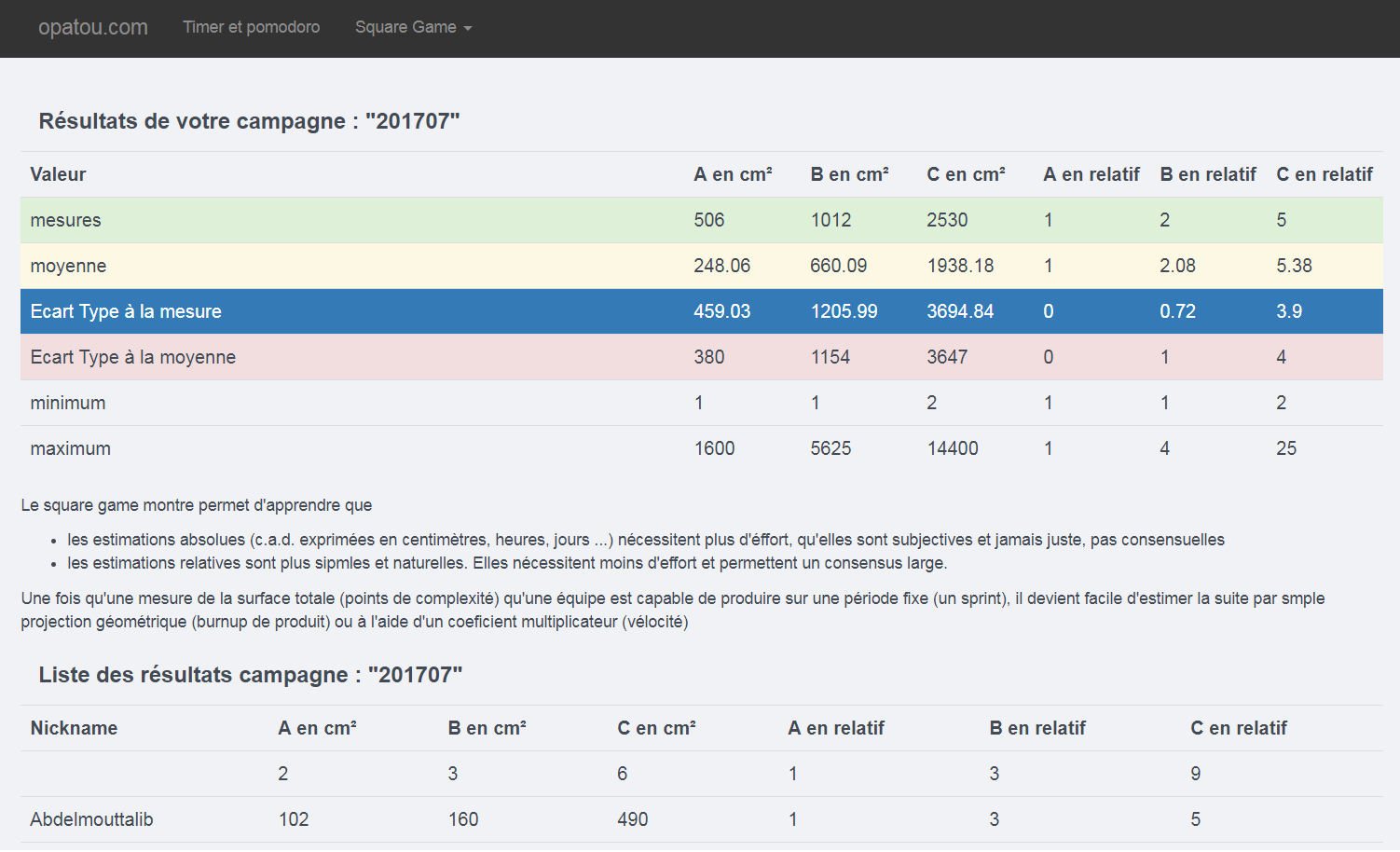 L’animateur voit en temps réel le nombre de personnes qui se connecte, qui répondent aux estimations en absolu (cm²) et ceux qui ont terminé les estimations en relatif.